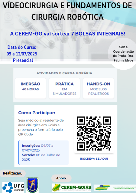 A CEREM-GO, em parceria com o **Curso de Vídeocirurgia e Fundamentos de Cirurgia Robótica**, vai sortear **7 VAGAS com isenção total** da inscrição! O curso acontece de **09 a 12 de julho** e inclui 40 horas de imersão, com prática em simuladores e hands-on em modelos realísticos.